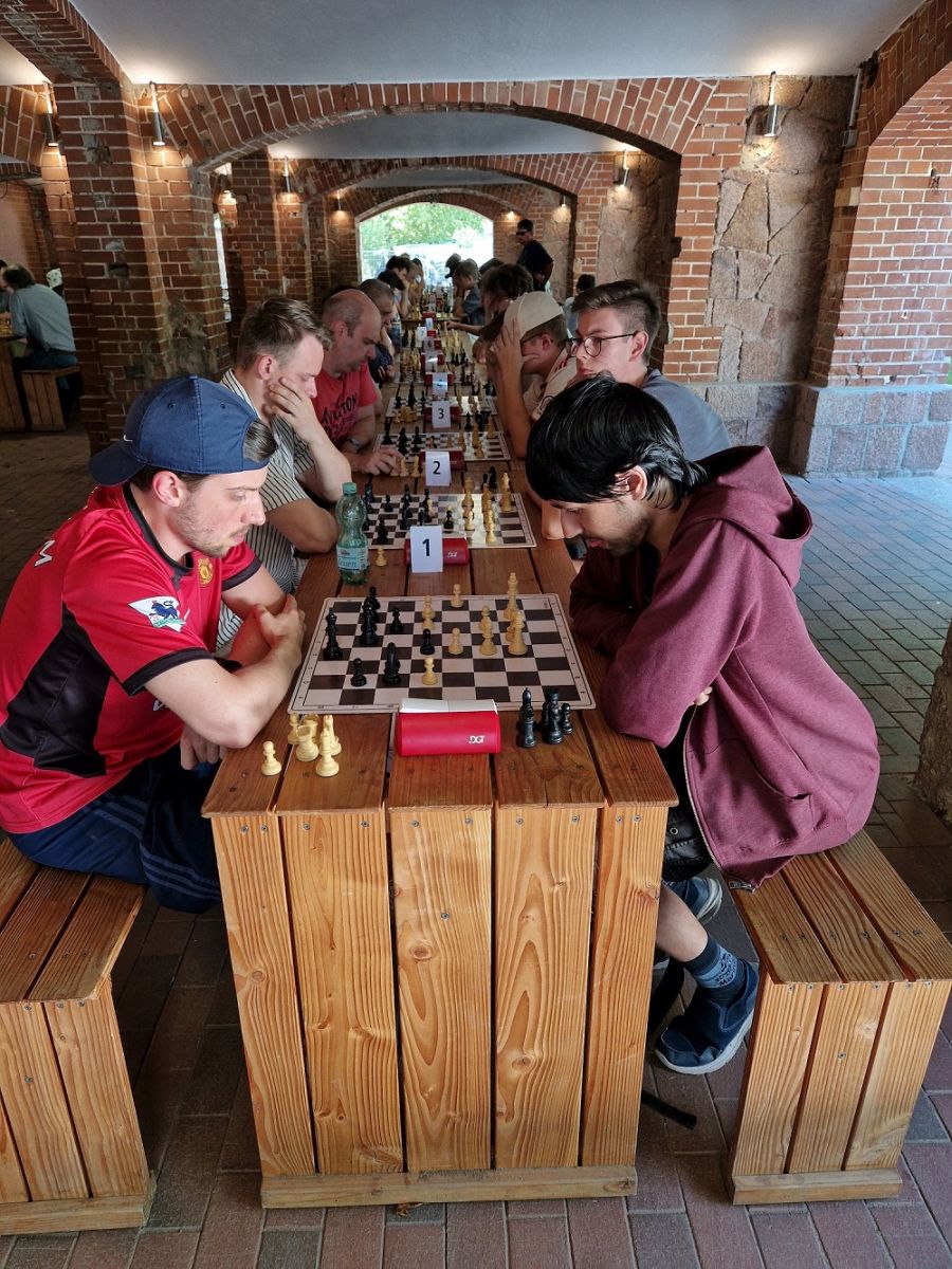 von links nach rechts: Nico Markus (SR), Gedeon Hartge, Daniel Ahmed, Robert Stein, Roland Katz (HSR)Genau 5 Jahre ist es her, als am 24. August 2019 die letzte Ausgabe des traditionsreichen Saale-Opens stattfand. Bedingt durch Corona musste 2020 und 2021 das Laternenfest ausfallen, in welchem Rahmen das Turnier seinen Platz jahrelang hatte. Erst in diesem Jahr war es für den USV Halle als Turnierveranstalter möglich, das Event wieder durchzuführen. Mit Unterstützung des Peißnitzhaus-Vereins wurden im Rahmen des Laternenfestes 2024 zusätzlich auch ein Kinderturnier und ganztägig Simultanwettkämpfe angeboten. Hier stellten sich Spieler der USV-Jugend U16 den Besuchern des Laternenfestes.